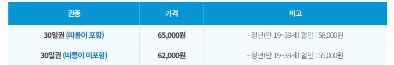 30일 기준으로 따릉이를 미포함 경우 62,000원이며 따릉이 포함하면 65,000원 입니다.