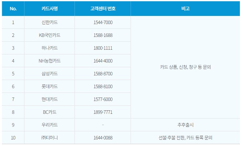 각 카드사에 대한 문의는 카드 상품, 신청, 청구 등 다양한 정보를 제공받을 수 있다.
